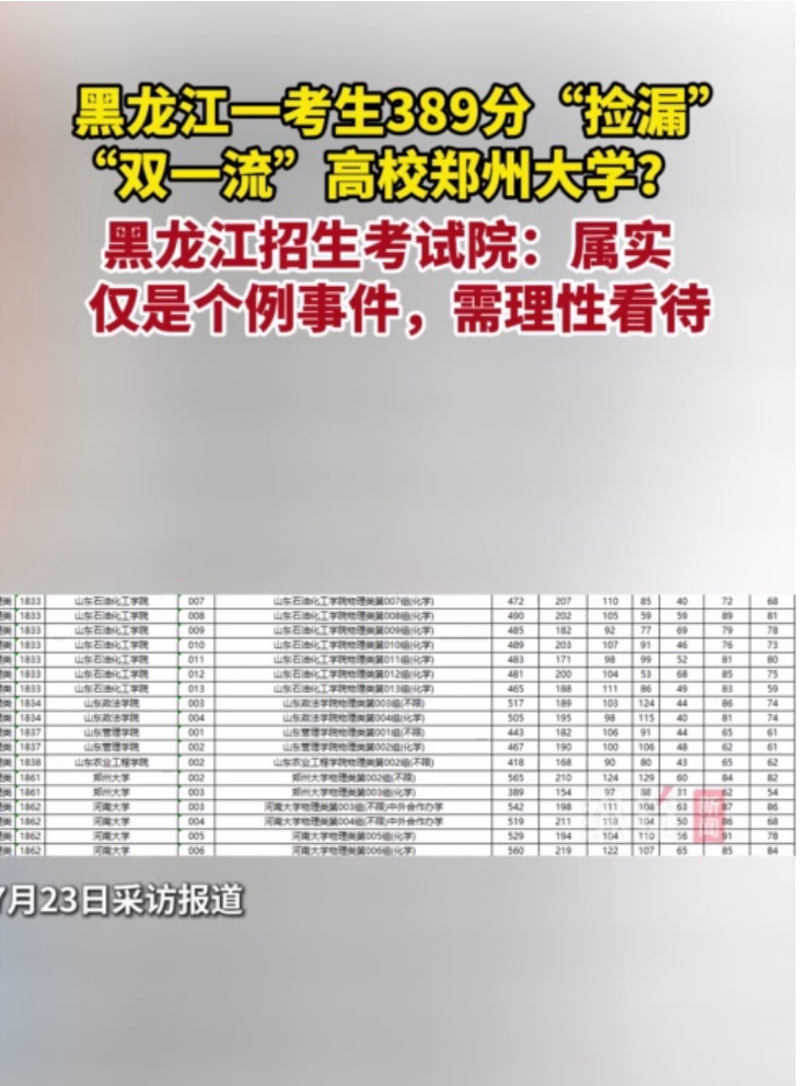 据纵览新闻,7月22日,黑龙江公布2025年普通高校招生普通本科批平行志愿投档分数线。有网友发视频称,发现郑州大学物理类003组(化学)最低投档线仅为389分,该考生被网友戏称“捡漏王”。