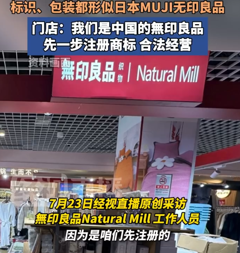 7月23日,经视直播记者联系上無印良品natural mill,工作人员表示门店主要销售床品、毛巾等日常用品,商标是先于日本MUJI无印良品注册的,所以是中国本土的無印良品,两家品牌毫无关联。
