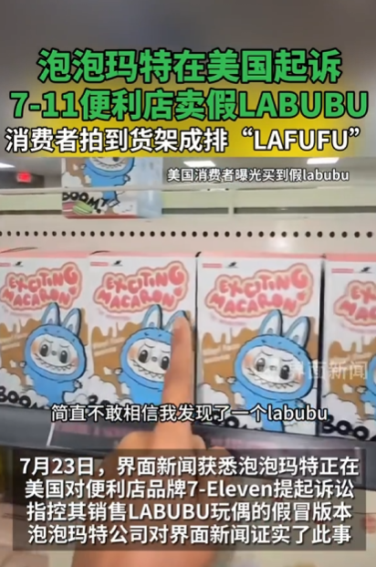 界面新闻此前曾报道,有美国女生在社交平台上发布短视频称,自己在美国的7-Eleven便利店买到了假货“LAFUFU”,视频画面中成排的假冒LABUBU被摆在货架上,而每个售价为25美元——几乎与正版原价相同,但无论是包装还是玩偶本身都粗制滥造。