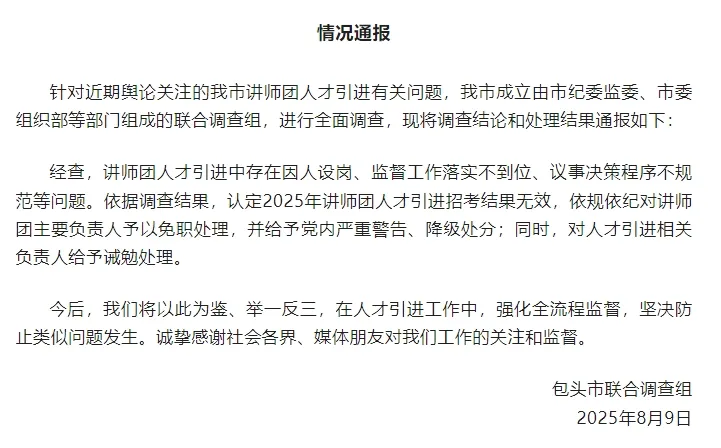 经查,讲师团人才引进中存在因人设岗、监督工作落实不到位、议事决策程序不规范等问题。依据调查结果,认定2025年讲师团人才引进招考结果无效,依规依纪对讲师团主要负责人予以免职处理,并给予党内严重警告、降级处分;同时,对人才引进相关负责人给予诫勉处理。