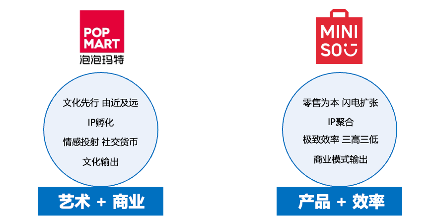 两家公司的出发点很像,都以潮流杂物零售起家。在2016年泡泡玛特打造了第一个IP爆品Molly之后,率先转型为一家"品牌+零售"的公司,它的核心理念是"艺术+商业"。