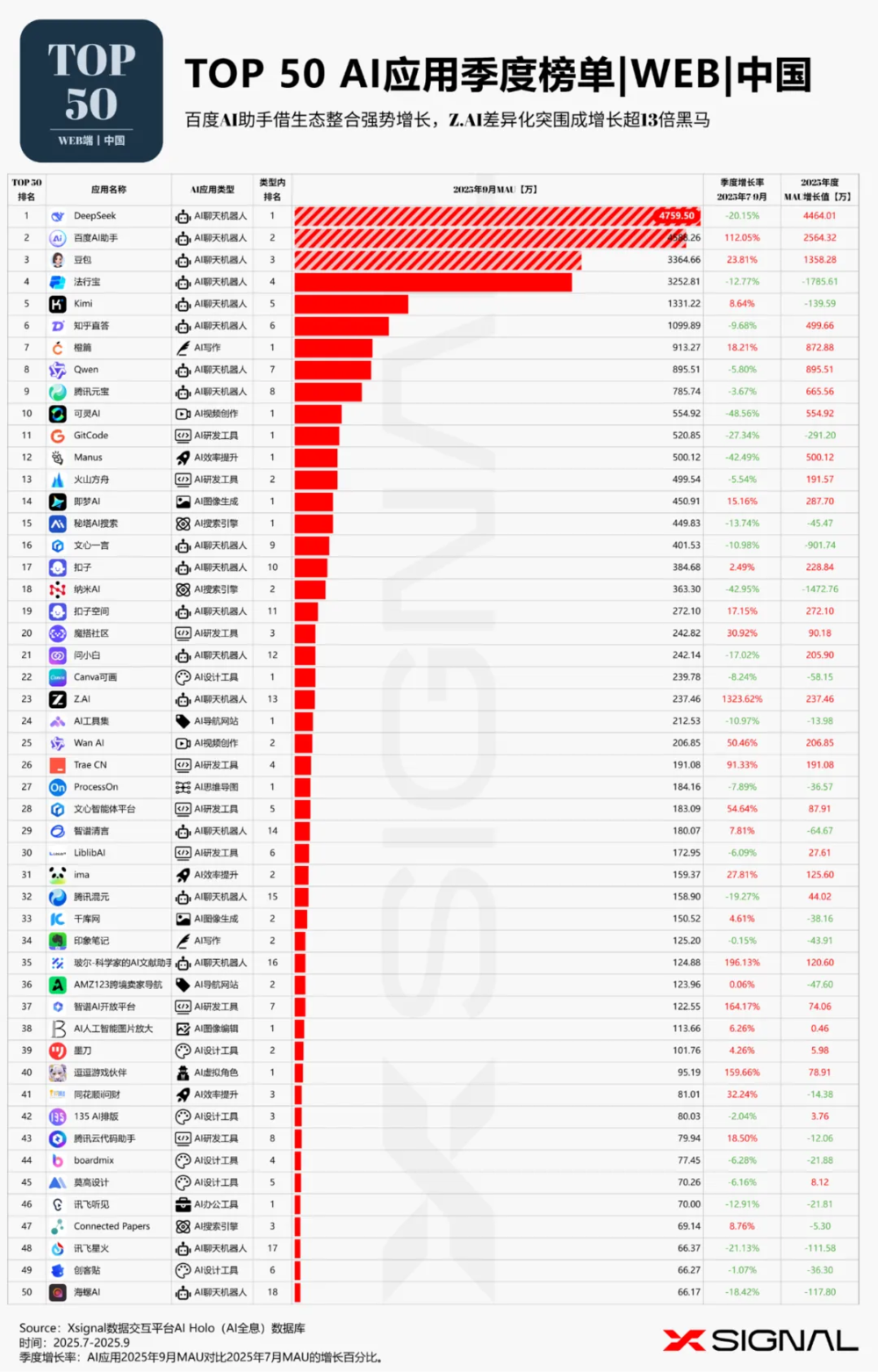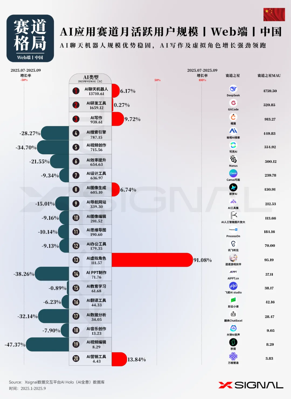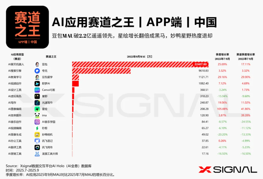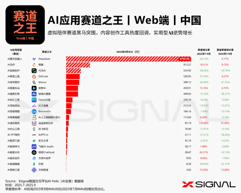 中国AI应用行业全景丨万字长文丨2025年9月丨赛道格局+赛道之王 + TOP 50 AI应用+增长之星丨Xsignal