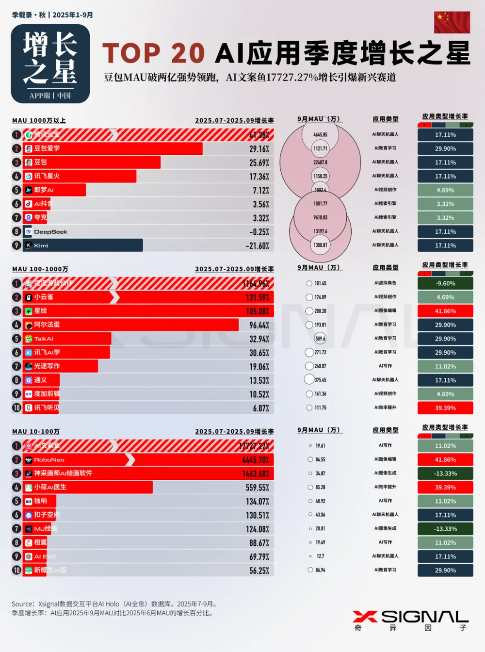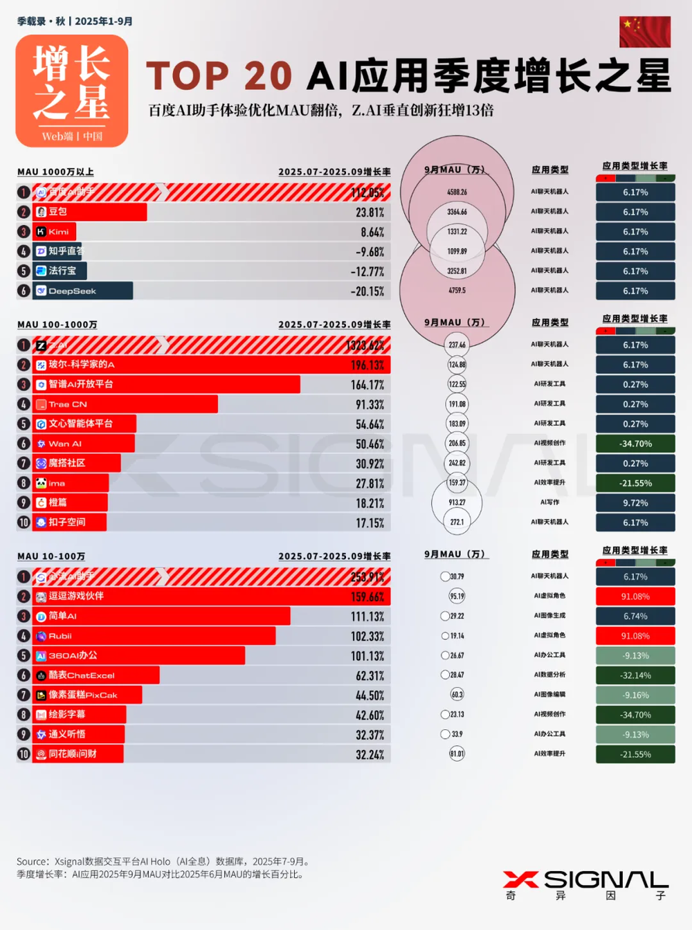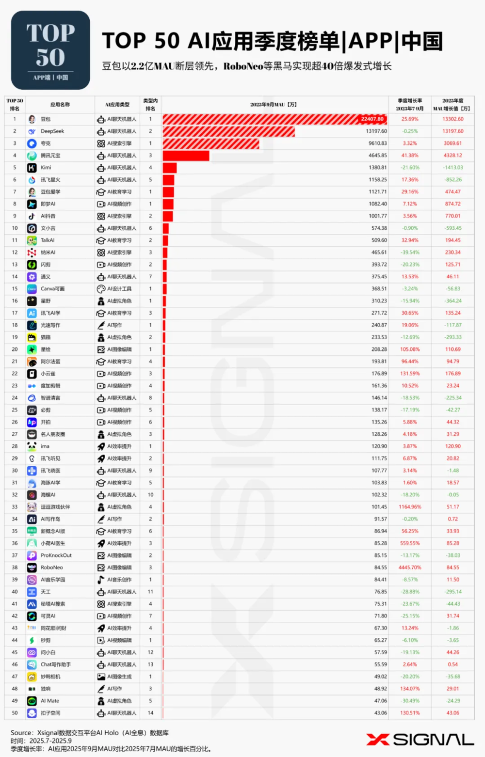 中国AI应用行业全景丨万字长文丨2025年9月丨赛道格局+赛道之王 + TOP 50 AI应用+增长之星丨Xsignal