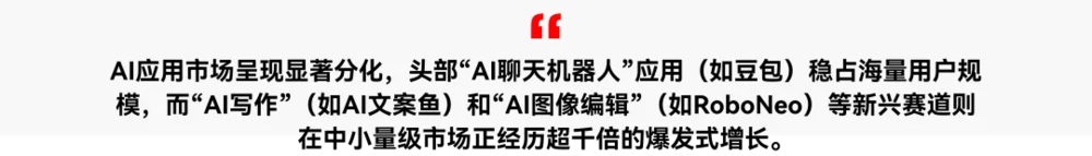 市场增长动力正从早期的新奇功能向“实用化、场景化”迁移,结构性增长明显。虽然AI聊天机器人规模巨大,但AI图片编辑和AI教育学习等赛道凭借强劲的季度增速,成为APP端最具潜力的增长引擎。在Web端,AI虚拟角色以91.08%的高增长率,显示出用户对情感交互陪伴的强烈需求。