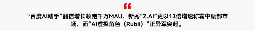本季度中国AI应用市场呈现出显著分化格局:头部效应极度集中,以豆包(APP端2.24亿MAU)和DeepSeek(APP端1.32亿MAU)为代表的通用AI聊天机器人,构筑了难以撼动的“亿级俱乐部”壁垒。APP端AI聊天机器人的月活规模高达2.9亿,持续巩固其作为市场核心流量入口的地位。同时,百度AI助手在Web端通过与百度生态的深度整合,实现了超过112%的季度增长,充分展现了“生态协同”是巨头加速用户渗透、巩固市场地位的关键战略。