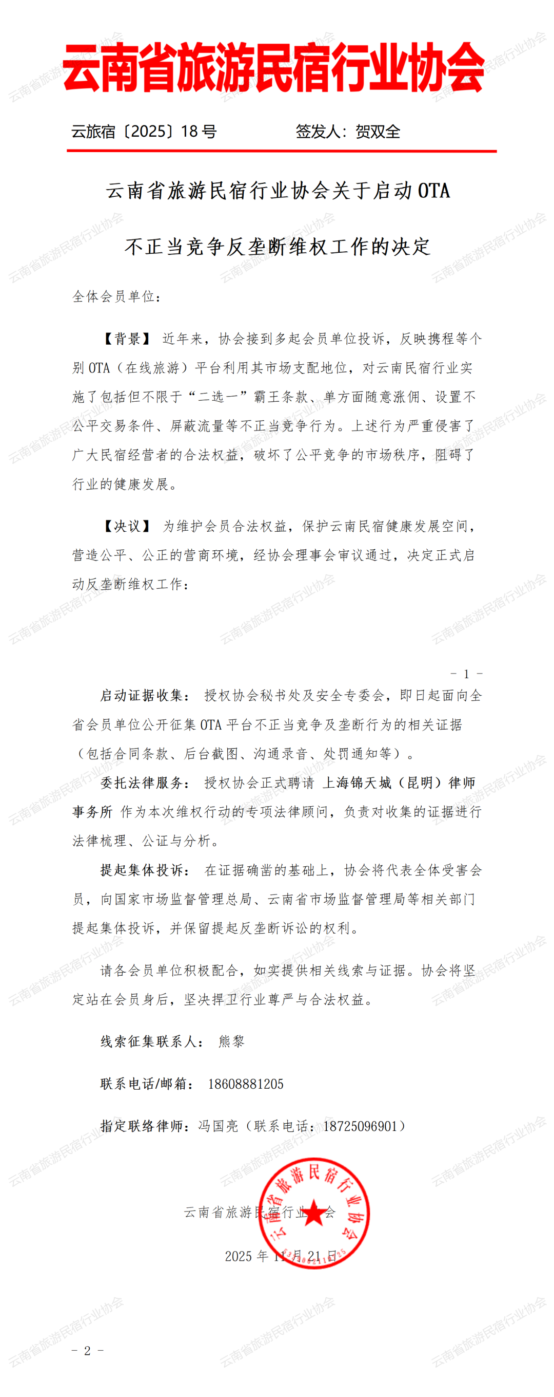 【云南省旅游民宿行业协会:对携程等在线旅游平台启动反垄断维权工作】