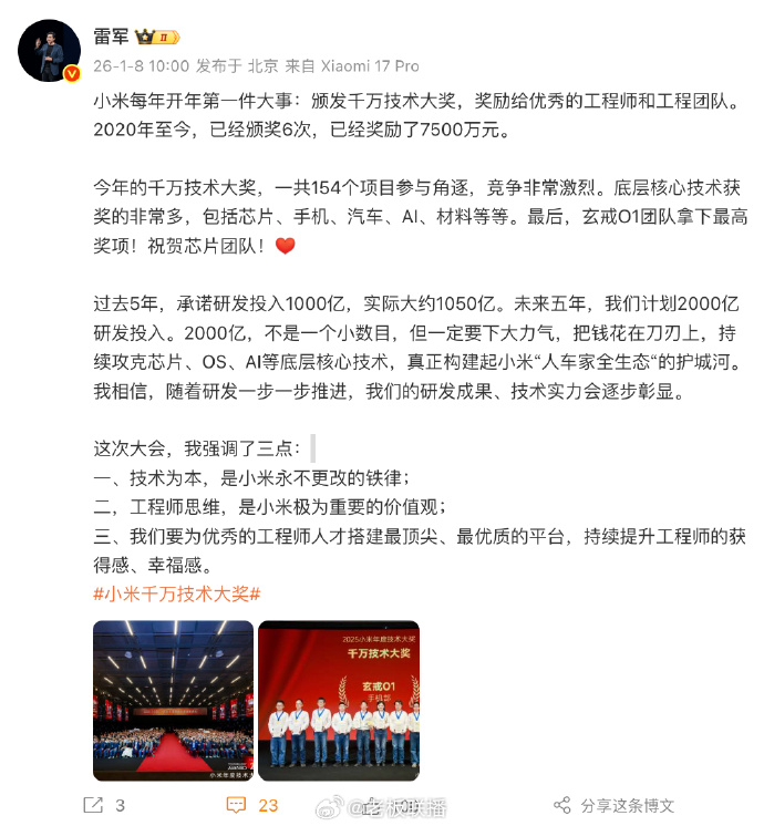 雷军发文宣布,小米每年开年第一件大事是颁发千万技术大奖,以奖励优秀工程师和工程团队。自2020年至今,已颁奖6次,累计奖励7500万元。今年共有154个项目参与角逐,竞争激烈,涉及芯片、手机、汽车、AI、材料等底层核心技术。最终,玄戒O1团队获得最高奖项。
