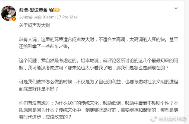 2月5日,追觅科技创始人兼CEO俞浩回应闷声发大财说法。他表示总有人说,这里的环境适合闷声发大财,不适合太高调,太高调的人死的快,甚至还给列举了一些前车之鉴。