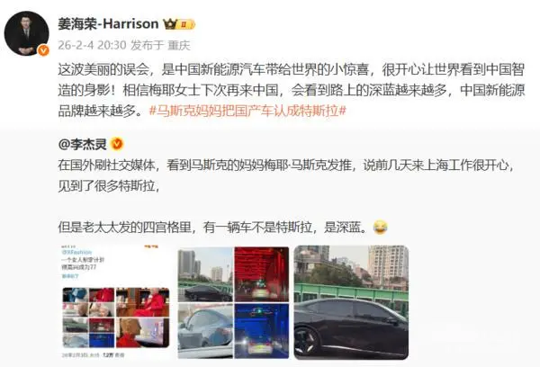 2月4日,深蓝汽车CEO姜海荣针对该事件作出回应,称这一"美丽的误会"是中国新能源汽车带给世界的小惊喜,直言"很开心让世界看到中国智造的身影",并表示坚信梅耶·马斯克下次到访中国时,将见证更多深蓝汽车及中国新能源品牌驰骋街头。