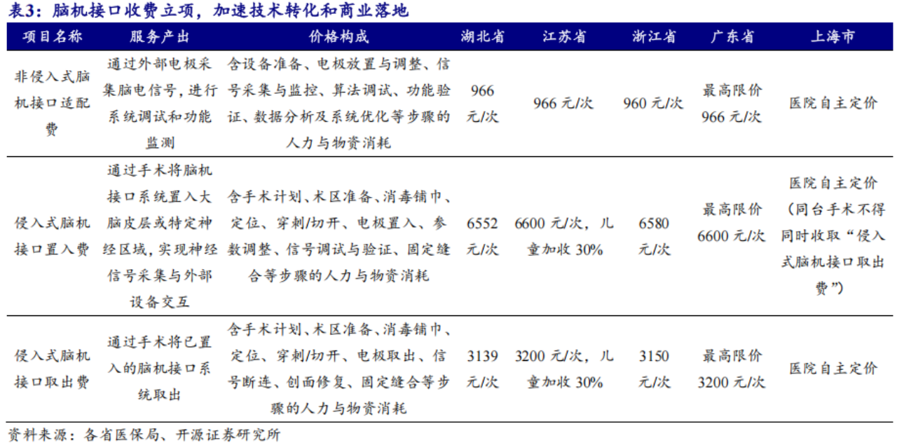 所以,医保局于2025年3月发布推出《神经系统类医疗服务价格项目立项指南(试行)》,为脑机接口治疗“定价”提供了官方依据。随后,湖北、浙江、江苏、广东、上海等地快速跟进,出台了具体的收费项目。