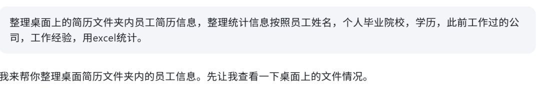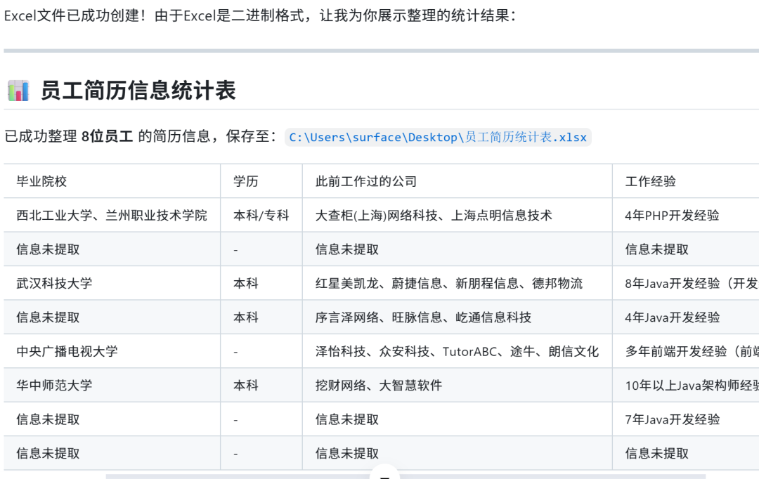 > "把桌面简历文件夹里的文档整理一下,提取每个人的姓名、毕业院校、此前工作经历和工作年限,汇总到 Excel 里。"