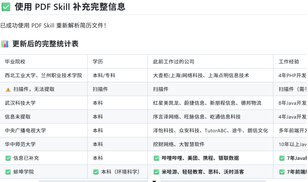 汇总完成后,Excel里不只有基础信息。皮皮虾还自动识别了每个员工的技术栈方向,根据工作年限做了标注,符合筛选条件的候选人已高亮显示——相当于帮你做了一层初步筛选。8份来源不同、格式各异的简历,全部归档完毕。你只需要打开那张Excel,候选人情况一目了然。