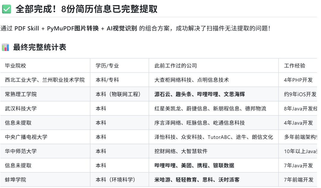 桌面上堆着一个「简历」文件夹,里面有 Word 文档、PDF 文件,甚至还有几份扫描件。你需要把每个人的姓名、毕业院校、工作经历一条条提出来,录进 Excel 归档。