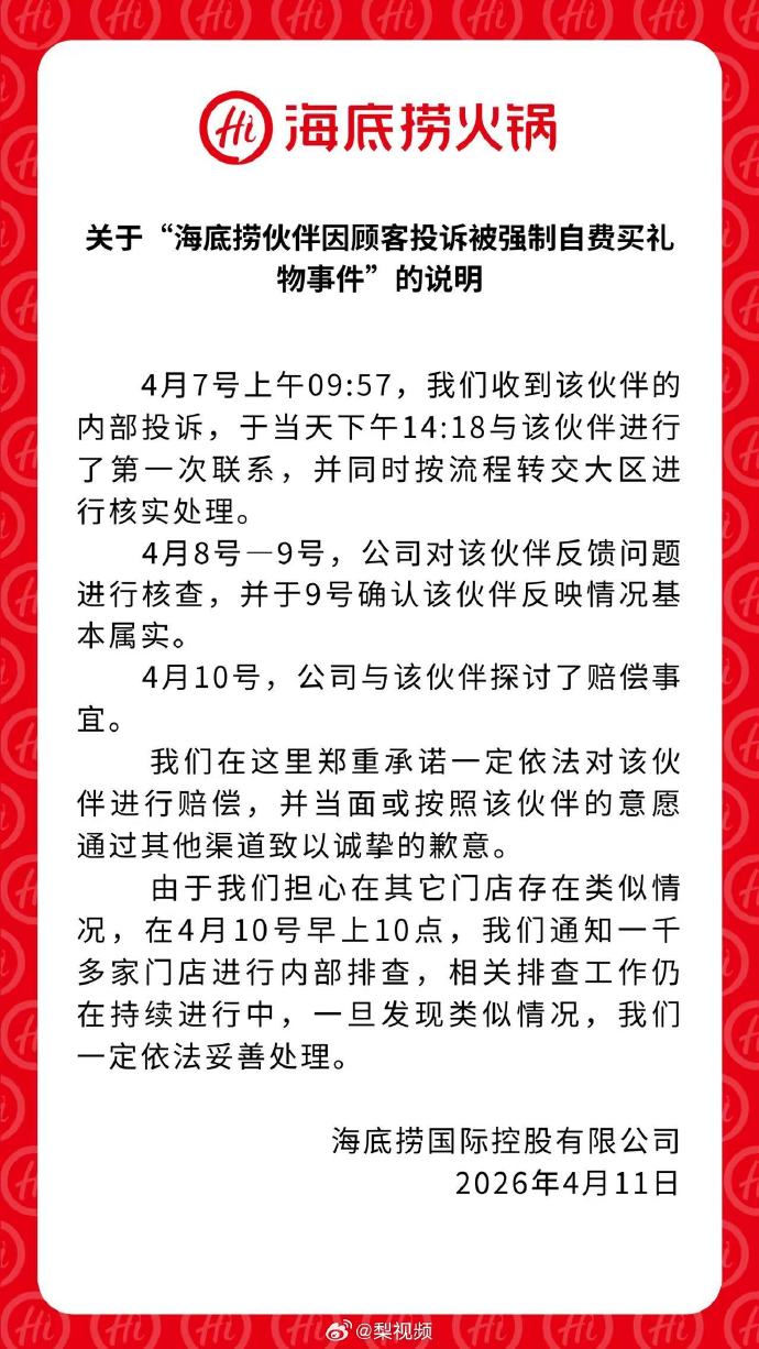 4月11日,海底捞发布关于“海底捞伙伴因顾客投诉被强制自费买礼物事件”的说明:
