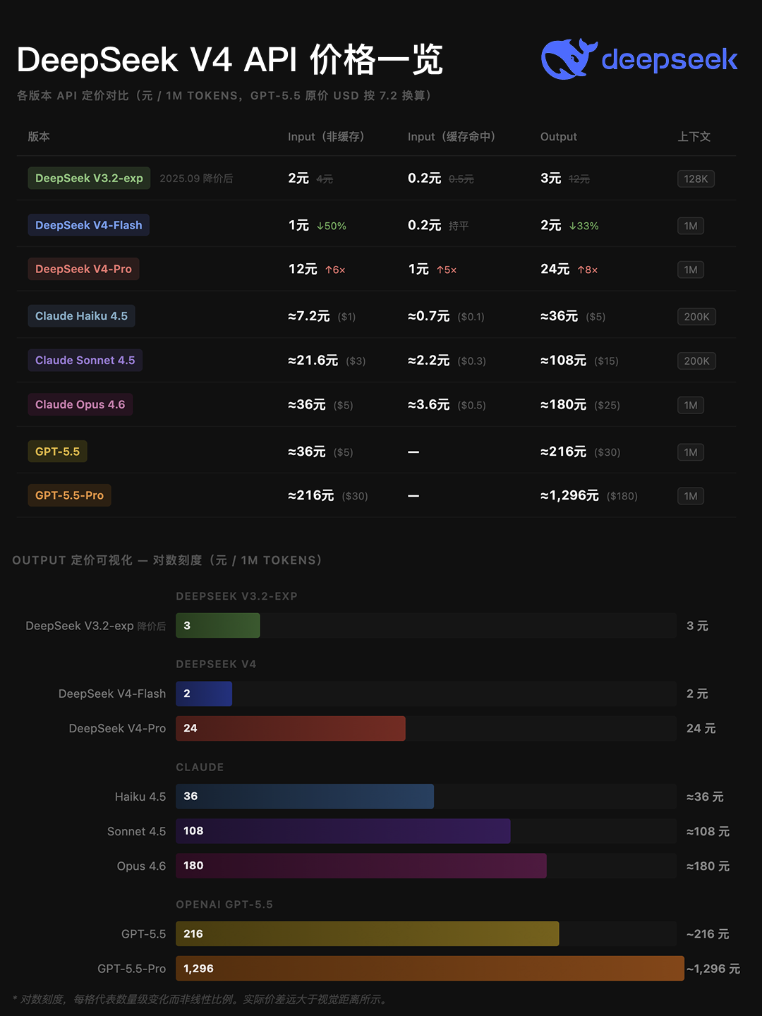 性能的变化就不说了,现在各路媒体都已经给出了详细的评测数据。我们关注一下 DeepSeek V4 版本的价格,其实很有特点。