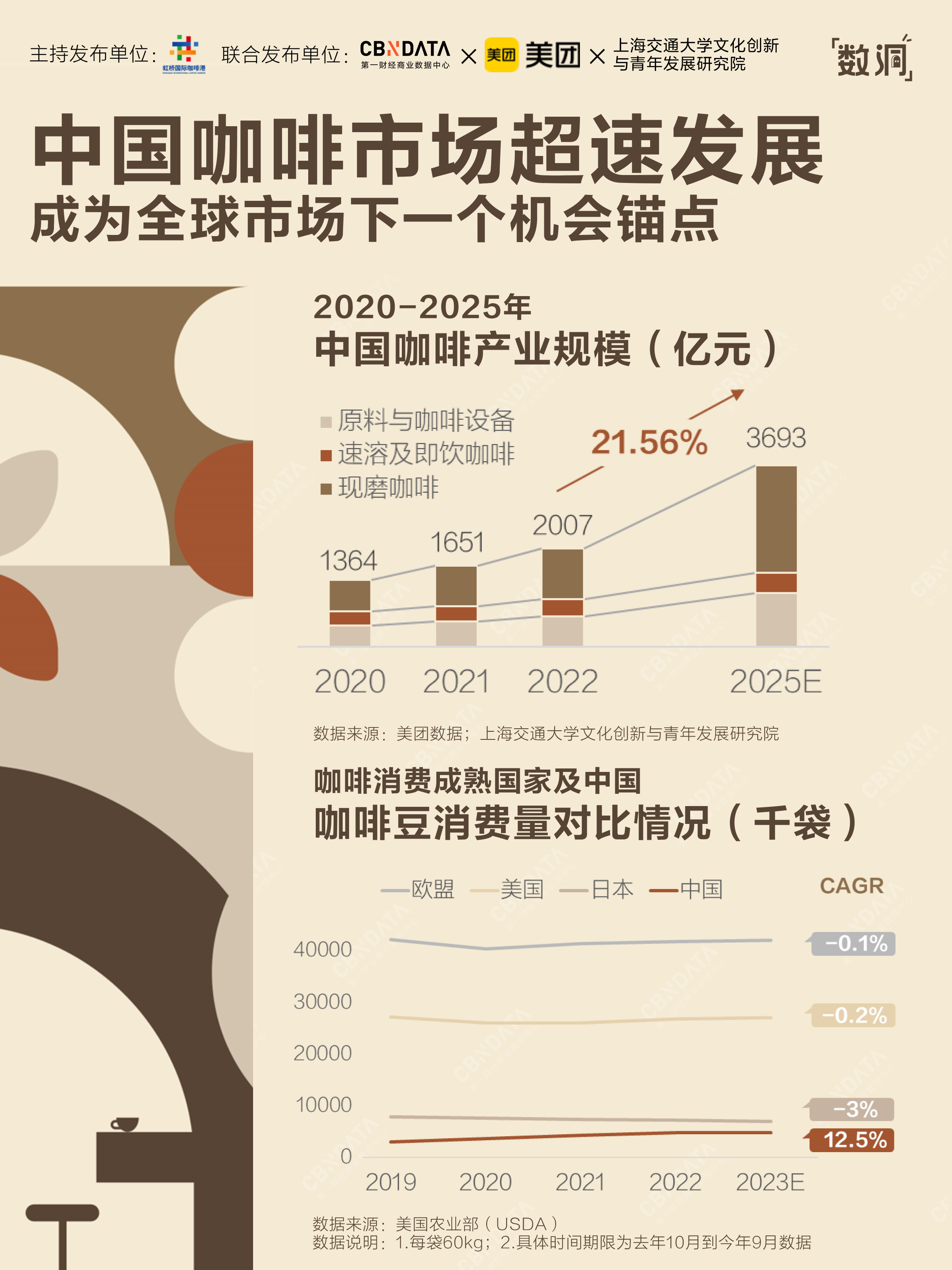 中国咖啡产业规模预计2025年达到3693亿元;中国咖啡豆消费量5年复合增长率高达12.5%