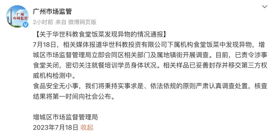 据广州市场监管消息,7月18日,相关媒体报道华世科教投资有限公司下属机构食堂饭菜中发现异物,增城区市场监督管理局立即会同区相关部门及属地镇街开展调查。目前,已责令涉事食堂关闭,密切关注就餐培训学员身体状况。相关样品已妥善封存并移交第三方权威机构检测中。食品安全无小事,我们将秉持实事求是、依法依规的原则严肃认真调查处置,核查结果将第一时间向社会公布。