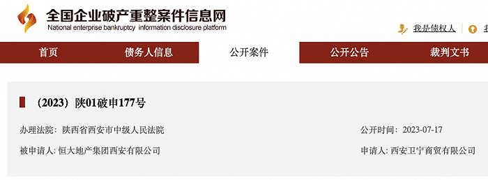 7月18日,据全国企业破产重整案件信息网显示,恒大地产集团西安有限公司被西安卫宁商贸有限公司申请破产,办理法院为陕西省西安市中级人民法院。