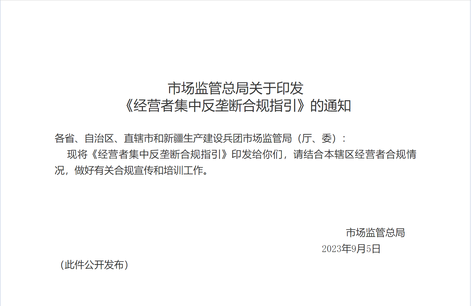 国家市场监督管理总局官网11日正式发布《经营者集中反垄断合规指引》。这是2008年《反垄断法》实施以来,国务院反垄断执法机构出台的首部经营者集中监管领域合规指导性文件,对提升经营者集中常态化监管水平具有重要意义。作为推进常态化监管的重要举措,《指引》体现以下特点:一是突出以服务为宗旨,《指引》提出市场监管部门要定期了解企业合规情况并给予必要支持,同时积极开展宣传和培训。二是突出以实效为基础,《指引》重在实现合规效果,不强制要求企业单独建立经营者集中合规制度,避免增加额外合规成本。三是突出以企业为中心,《指引》充分考虑不同类型企业管理模式的差异性以及从事投资并购的频繁程度,在合规建设方面给予企业足够灵活度。四是突出以问题为导向,《指引》首次引入案例说明,帮助企业更好理解投资并购各环节可能面临的合规风险。