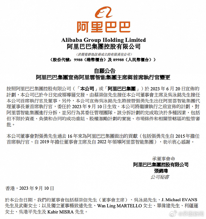 据界面新闻报道,阿里巴巴9月11日早间在港交所公告,按照阿里巴巴集团于2023年6月20日宣布的计划,公司已于今日完成领导层交接,由蔡崇信接任公司董事会主席及吴泳铭接任公司首席执行官及董事。另外,公司宣布吴泳铭将接替张勇出任阿里云智能集团代理董事长兼首席执行官,委任于2023年9月10日生效。公司将继续执行之前宣布的计划,对阿里云智能集团进行分拆,并另行为其委任管理团队。该分拆计划的完成取决于多种因素,包括但不限于资产、负债和合同的成功重组、股权激励计划的实施、市场条件和相关管辖区的监管审批。公司董事会对张勇过去16年来为阿里巴巴集团做出的贡献(包括张勇自2015年担任首席执行官、自2019年担任董事会主席及自2022年领导阿里云智能集团),表示衷心感谢。