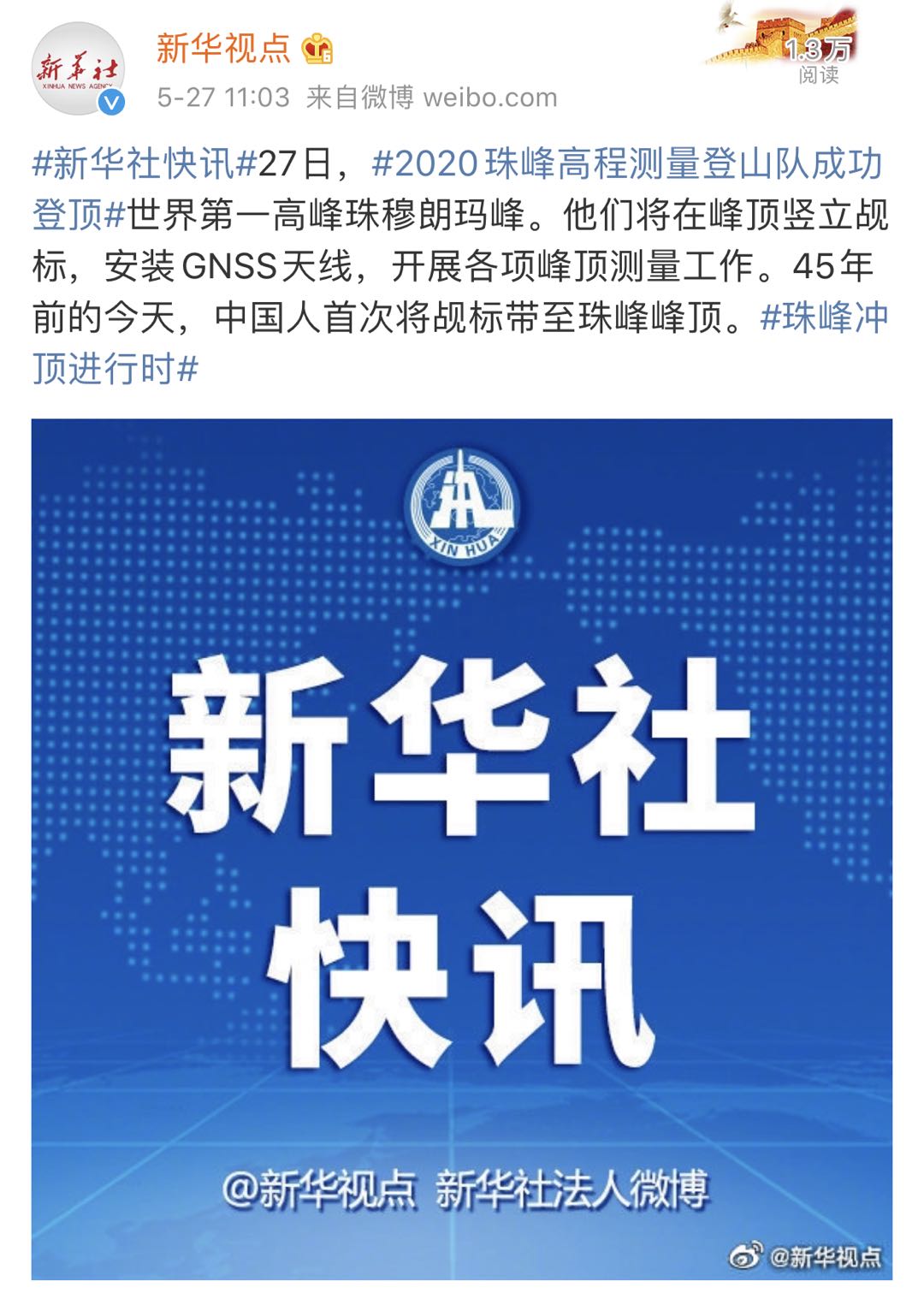 2020珠峰高程测量登山队登顶成功。27日,2020珠峰高程测量登山队成功登顶世界第一高峰珠穆朗玛峰。他们将在峰顶竖立觇标,安装GNSS天线,开展各项峰顶测量工作。45年前的今天,中国人首次将觇标带至珠峰峰顶。