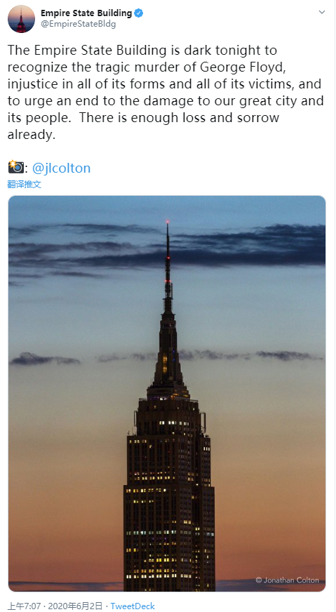 纽约帝国大厦在其官方推特账号上发布消息称,帝国大厦今晚(当地时间6月1日晚)熄灯,以回应乔治·弗洛伊德被“悲剧性谋杀”,以及“一切形式的不公正及其所有的受害者”。推文还写道,“还为了呼吁结束那些对我们伟大城市和人民的伤害。损失和悲伤已经足够多了。”