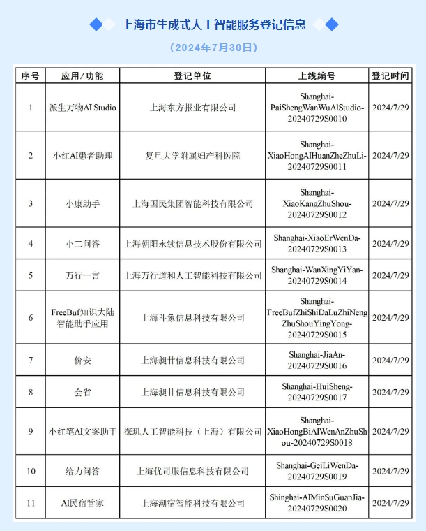 截至7月30日,上海市新增11款已完成登记的生成式人工智能服务,累计已完成20款生成式人工智能服务登记。