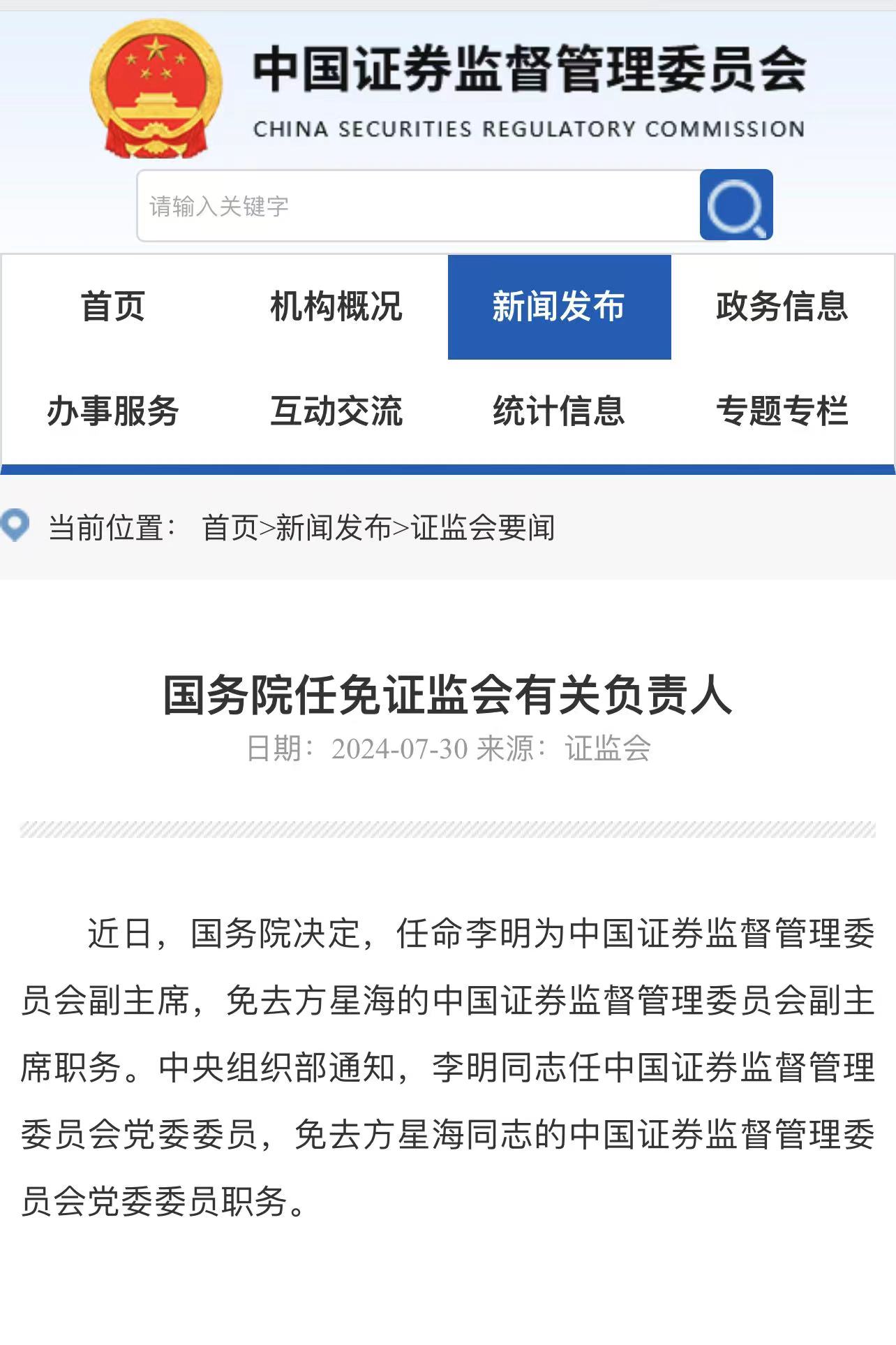国务院决定任命李明为证监会副主席,免去方星海的证监会副主席职务。