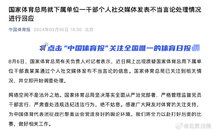 据北京日报援引中国体育报消息,8月6日,国家体育总局有关负责人对记者表示,近日网上出现质疑国家体育总局下属单位干部袁某某通过个人社交媒体发布不当言论的信息。国家体育总局已关注到相关情况,并立即开始调查处理。