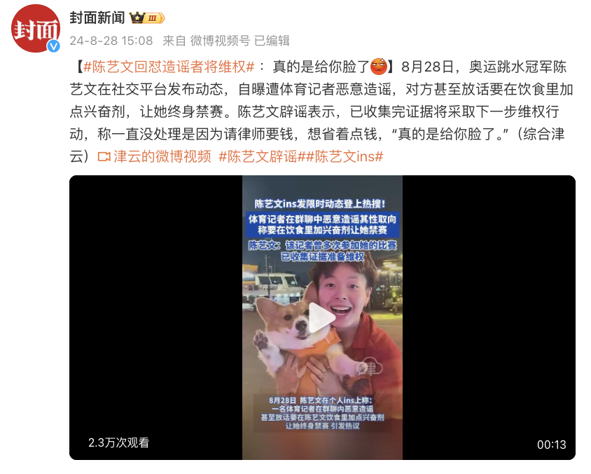 据封面新闻、津云消息,8月28日,奥运跳水冠军陈艺文在社交平台发布动态,自曝遭体育记者恶意造谣,对方甚至放话要在饮食里加点兴奋剂,让她终身禁赛。陈艺文辟谣表示,已收集完证据将采取下一步维权行动,称一直没处理是因为请律师要钱,想省着点钱,“真的是给你脸了。”