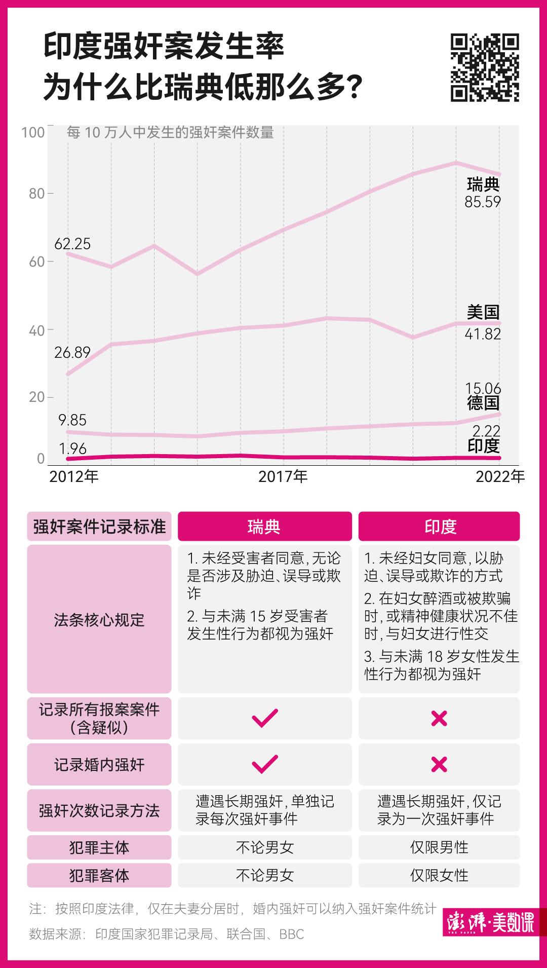 这主要是因为瑞典对强奸的定义更加广泛,而且人们的报警意识更强。而印度对强奸的定义局限在男性对女性的强奸行为,也不包含妻子与丈夫同居时的婚内强奸。
