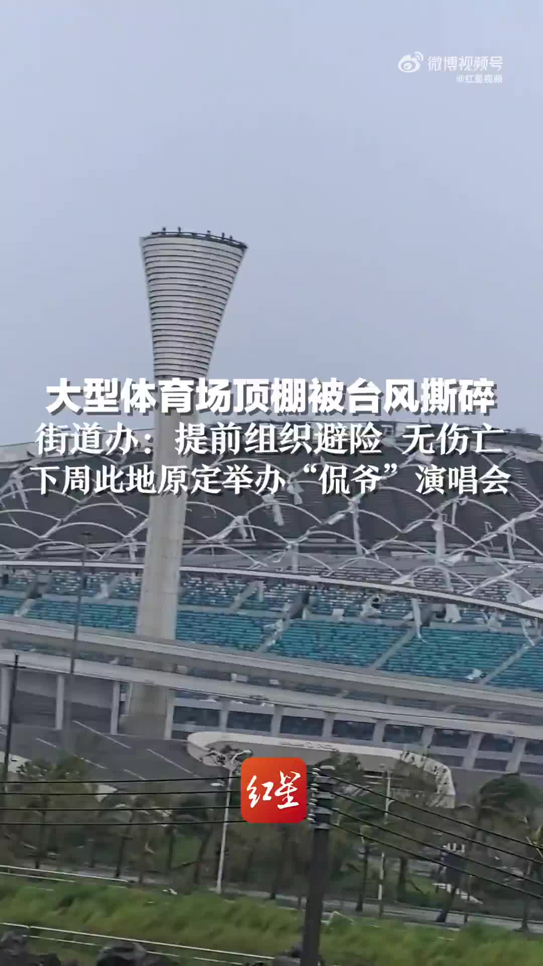 侃爷海口演唱会场地顶棚被台风撕碎。