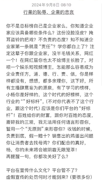 9月7日晚,小杨哥在与辛巴发生争端后首次开播,并对此进行回应。他称,“我觉得吵没必要,企业不是吵来吵去就能做起来的。” 今日早上,辛巴在某社交平台上发表长文,他在文中表示,“你不是总标榜自己是企业家么,你知道企业家应该具备哪些条件么?这份没脸没皮?掩耳盗铃的把戏?知不知道企业家第一条就是'责任'?学你都白上了?注定这辈子你跟企业家,没半毛钱关系,网红一个!”