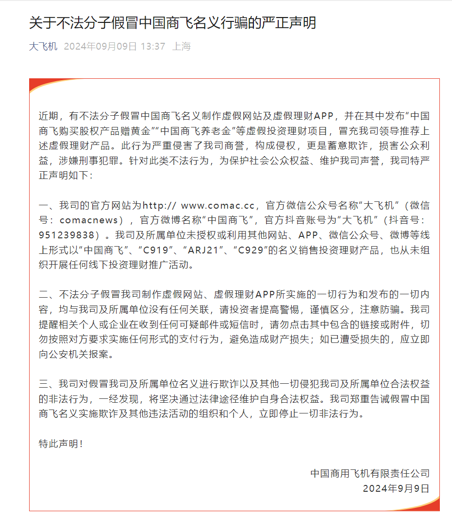 据澎湃新闻,9月9日,据大飞机微信公号,中国商用飞机有限责任公司发布关于不法分子假冒中国商飞名义行骗的严正声明。近期,有不法分子假冒中国商飞名义制作虚假网站及虚假理财APP,并在其中发布“中国商飞购买股权产品赠黄金”“中国商飞养老金”等虚假投资理财项目,冒充公司领导推荐上述虚假理财产品。此行为严重侵害了我司商誉,构成侵权,更是蓄意欺诈,损害公众利益,涉嫌刑事犯罪。