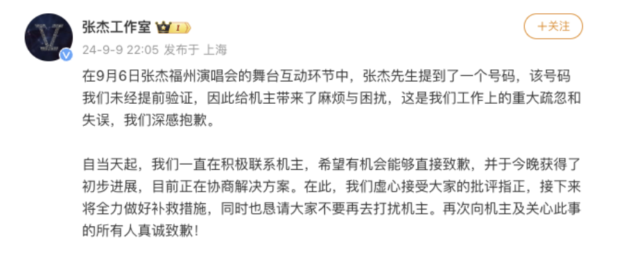 9月9日晚,张杰工作室就福州演唱会互动环节中公布他人电话号码发文致歉称,已于今晚获得了初步进展,目前正在协商解决方案。