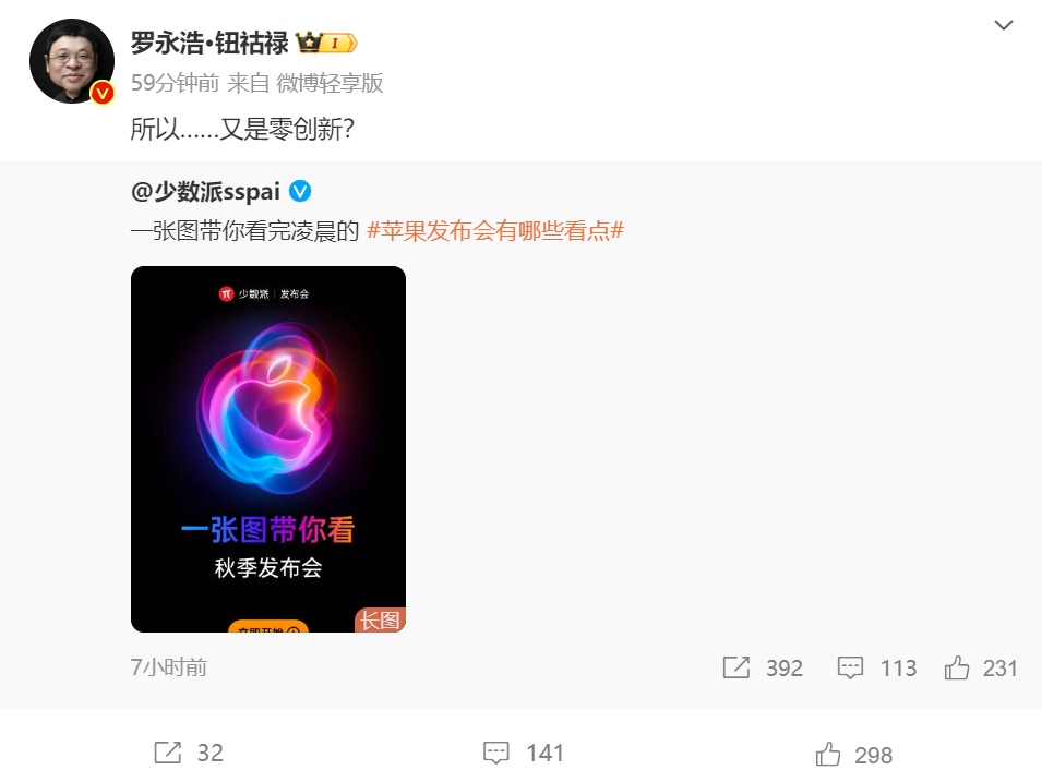 9月10日,罗永浩转发了一条“一张图带你看完凌晨的苹果发布会有哪些看点”微博,并表示,“所以……又是零创新?”