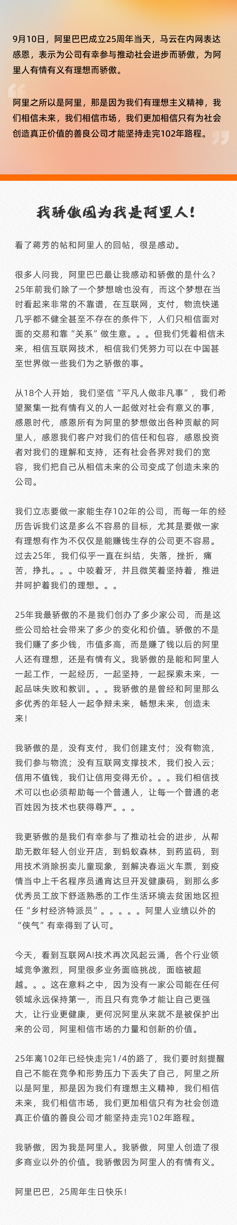 据潮新闻,9月10日是阿里巴巴成立25周年,马云在阿里巴巴内网发帖鼓励阿里人:“阿里之所以是阿里,那是因为我们有理想主义精神,我们相信未来,我们相信市场,我们更加相信只有为社会创造真正价值的善良公司才能坚持走完102年路程。”