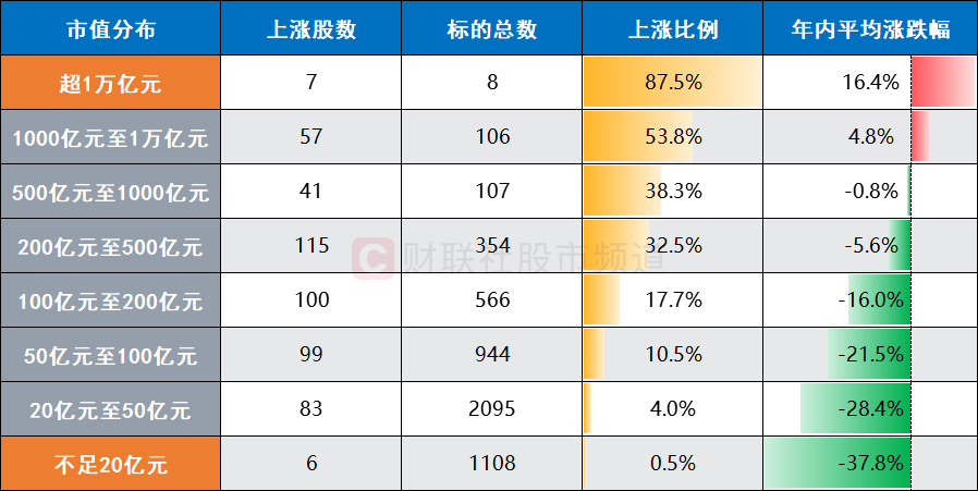 据财联社,近期,市场整体延续调整态势,年内收跌个股数量不断增加。截至今日(9月10日)收盘,不计算今年上市新股,A股年内平均下跌近24.99%,中位数跌幅近27.63%。其中,仅有508只个股年内实现收涨,占整个A股的9.6%,“红盘率”已跌破一成。