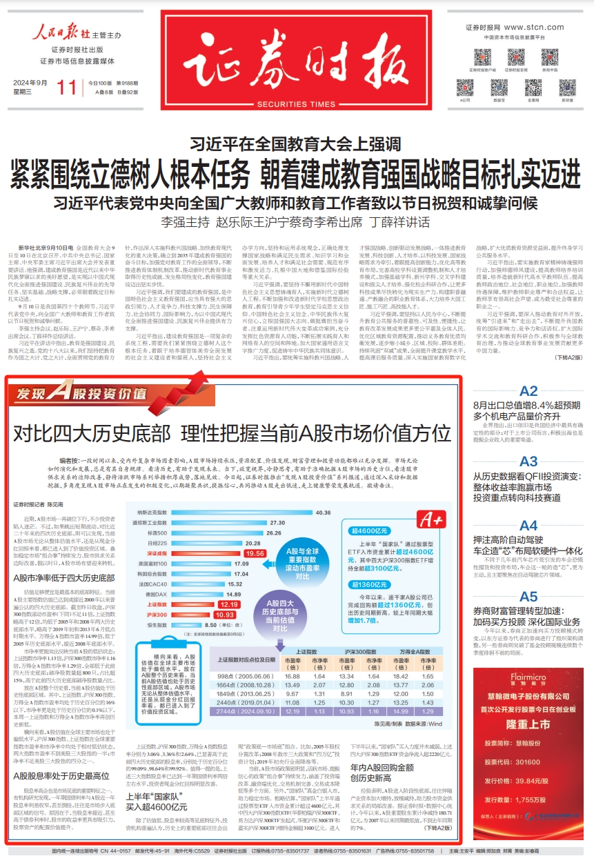 具体来看,A股市净率低于四大历史底部。A股股息率处于历史最高位。当前,A股市场政策底明显,活跃市场、提振信心的政策“组合拳”持续发力,涵盖了投资端改革、融资端优化、交易机制完善、交易成本降低等多个方面。另外,“国家队”真金白银入市,助力稳定市场。粗略估算,“国家队”上半年通过股票型ETF入市资金累计超过4600亿元。与此同时,上市公司回购出现高峰。数据显示,今年以来,逾千家A股公司已完成回购额超1360亿元,创出历史同期新高,较上年同期增加1.7倍。