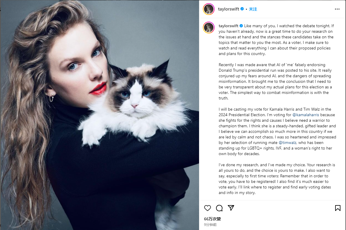 泰勒·斯威夫特否认“支持特朗普”,宣布将投票给哈里斯。
