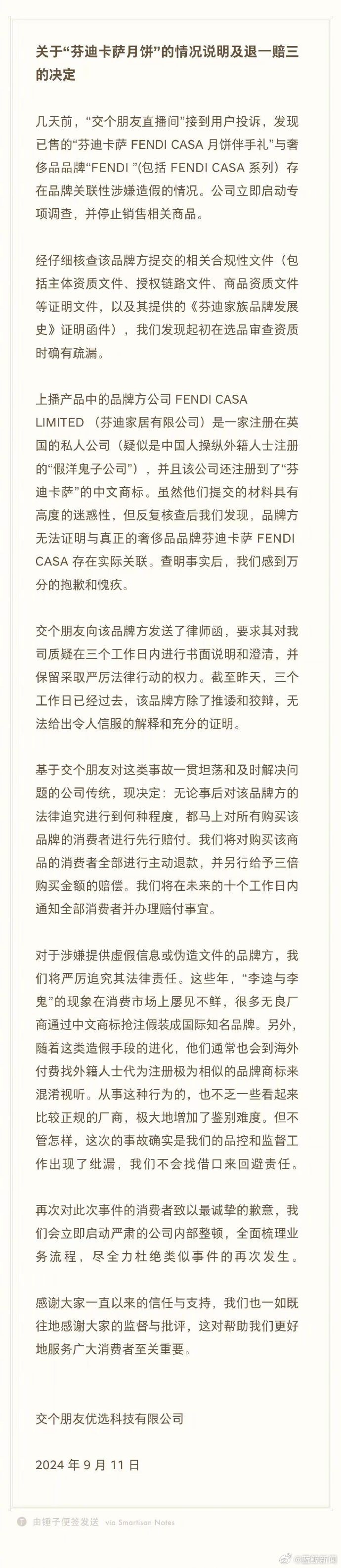 据蓝鲸新闻,交个朋友直播间发布声明称,发现销售的“芬迪卡萨 FENDI CASA 月饼伴手礼”与真正的奢侈品品牌“FENDI”(包括FENDI CASA系列)并无实际关联,涉嫌品牌造假。公司进行调查后,停止了相关商品的销售并对所有购买用户先行赔付,退一赔三。