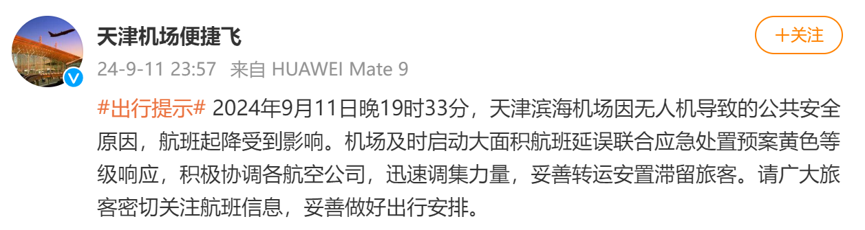 据界面新闻,天津滨海国际机场官方微博9月11日晚发布消息,2024年9月11日晚19时33分,天津滨海机场因无人机导致的公共安全原因,航班起降受到影响。机场及时启动大面积航班延误联合应急处置预案黄色等级响应,积极协调各航空公司,迅速调集力量,妥善转运安置滞留旅客。天津机场称,请广大旅客密切关注航班信息,妥善做好出行安排。