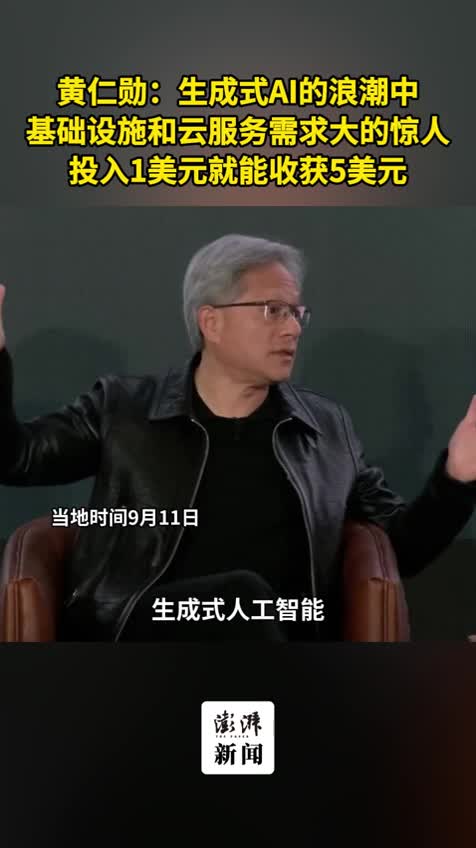 当地时间9月11日,黄仁勋表示,在生成式AI的浪潮中基础设施和云服务需求大的惊人,投入1美元就能收获5美元。(via 澎湃新闻)