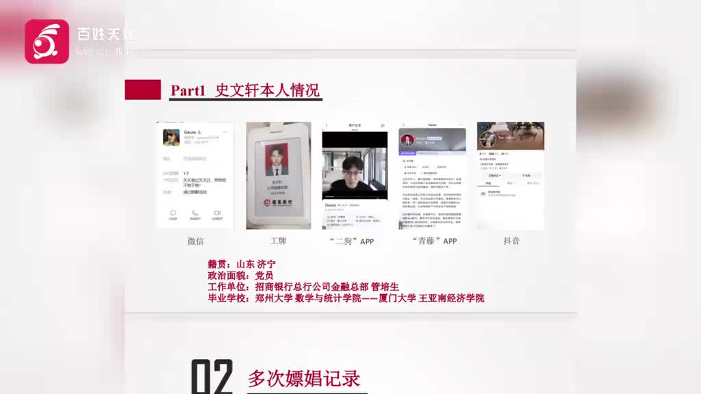 9月18日,广东省深圳市一女子制作58页PPT爆料其男友招商银行管培生史某某,与多名女性约炮、嫖娼、出轨。内容显示其与史某某于2023年10月确立恋爱关系。PPT从5个方面列举史某某的约炮、嫖娼等证明,列举了9次嫖娼记录。其中8月25日打网约车到深业有居金三角店进行嫖娼,支付creamyFreesia账户3000元。PPT内附有截图证明10次嫖娼金额为30330元,每次费用在2000元至5000元不等。史某某曾下跪哀求女友不要对其进行举报,立誓重新做人。