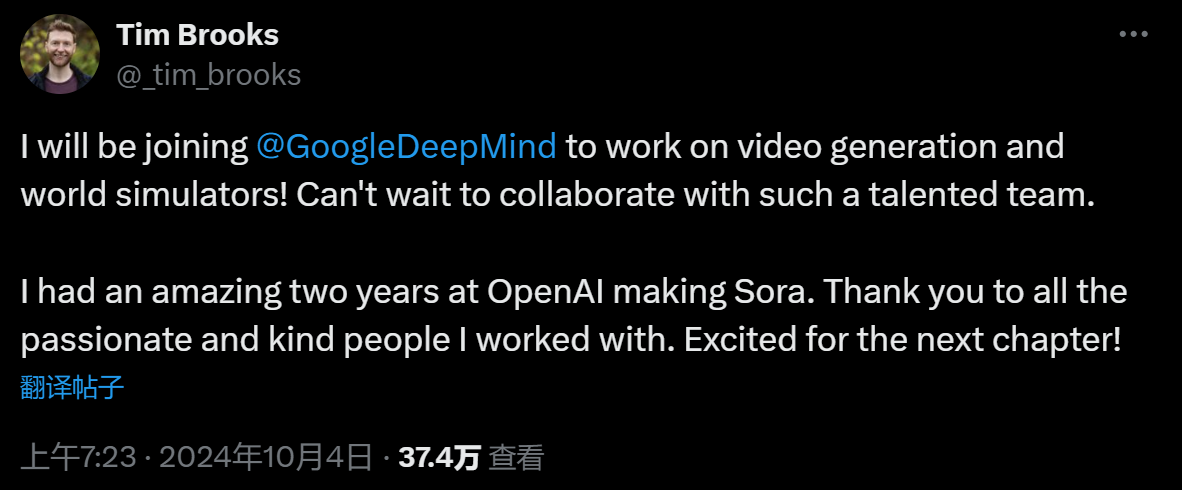 OpenAI又失一员猛将!Sora负责人之一宣布跳槽谷歌Deepmind。