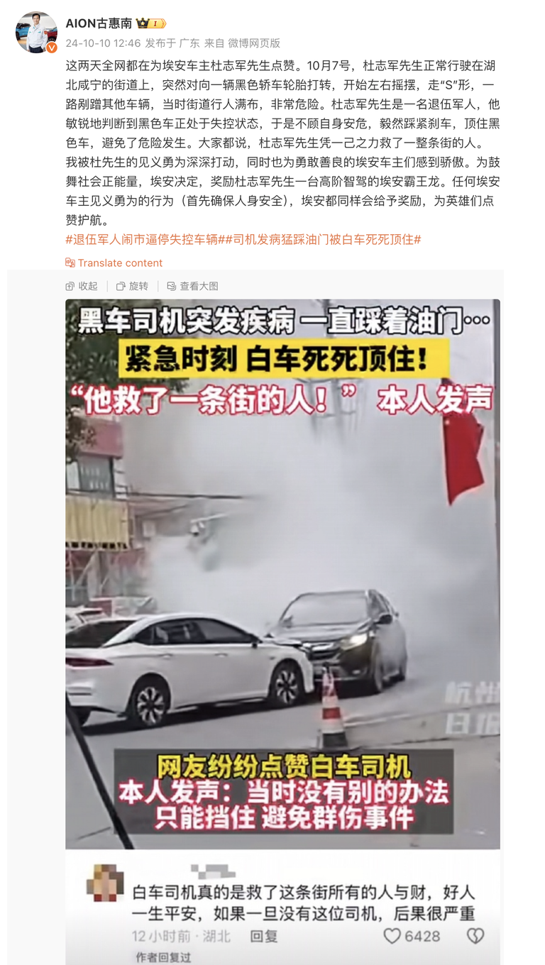 杜志军闹市逼停失控车辆,广汽埃安决定奖励他一台新车。