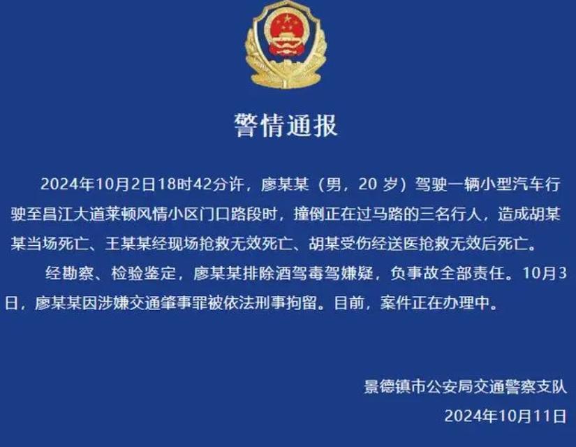 10月11日晚,江西景德镇市公安局交通警察支队发布警情通报称,10月2日18时42分许,廖某某(男,20岁)驾驶一辆小型汽车行驶至昌江大道莱顿风情小区门口路段时,撞倒正在过马路的三名行人,造成胡某某当场死亡、王某某经现场抢救无效死亡、胡某受伤经送医抢救无效后死亡。