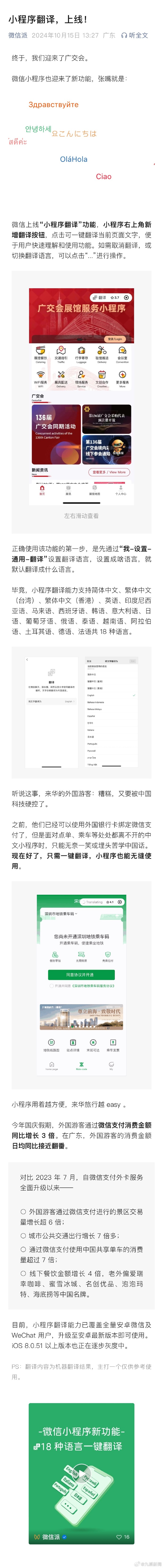 据九派新闻,10月15日,据微信派,微信上线“小程序翻译”功能,小程序右上角新增翻译按钮,点击可一键翻译当前页面文字,便于用户快速理解和使用功能。如需取消翻译,或切换翻译语言,可以点击“...”进行操作。