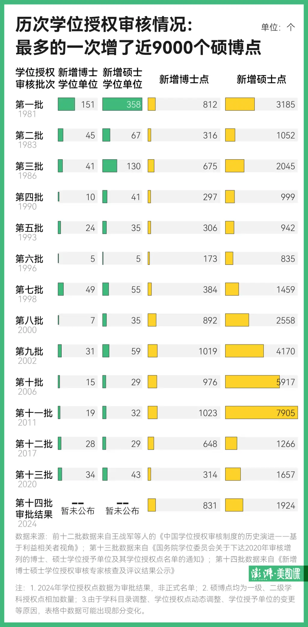 据澎湃,今年暑期,国务院学位委员会办公室发布的《新增博士硕士学位授权审核专家核查及评议结果公示》引发关注。其中一组数据显示,此次授权审核共新增831个博士学位授权点和1924个硕士学位授权点。