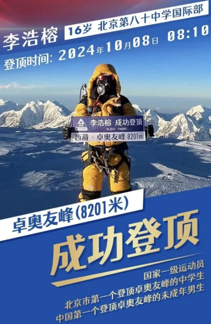 据新京报报道,10月8日8时10分,来自北京市第八十中学国际部的16岁学生李浩榕,成功登顶海拔8201米的世界第六高峰——卓奥友峰,他不仅是第一个登顶此峰的北京中学生,还是中国第一个登顶卓奥友峰的未成年男性。